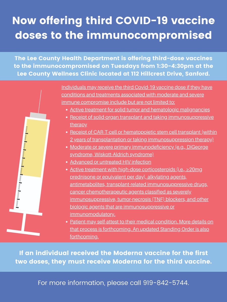 Please note that printed applications for. Email us with your questions at familyplanningleecountyncgov Please do not disclose. The Lee County Health Department is offering third-dose vaccines to the immunocompromised on Tuesdays from 130-430pm at the Lee County Wellness Clinic.